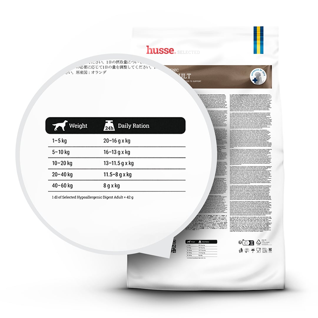Rendi più piacevole il momento dei pasti con Husse Hypoallergenic Digest Adult, una ricetta Super Premium ipoallergenica studiata per favorire una digestione ottimale, ideale per cani con digestione sensibile. Realizzata con ingredienti delicati e facilmente digeribili, non contiene grano, mais, soia, pollo e latticini, riducendo il rischio di disturbi alimentari. Arricchita con prebiotici, olio di salmone, semi di lino e biotina, non solo favorisce l'equilibrio intestinale e un sistema immunitario forte, ma aiuta anche a mantenere la pelle morbida e il pelo lucido. Una scelta completa e nutriente per cani adulti con stomaco delicato.