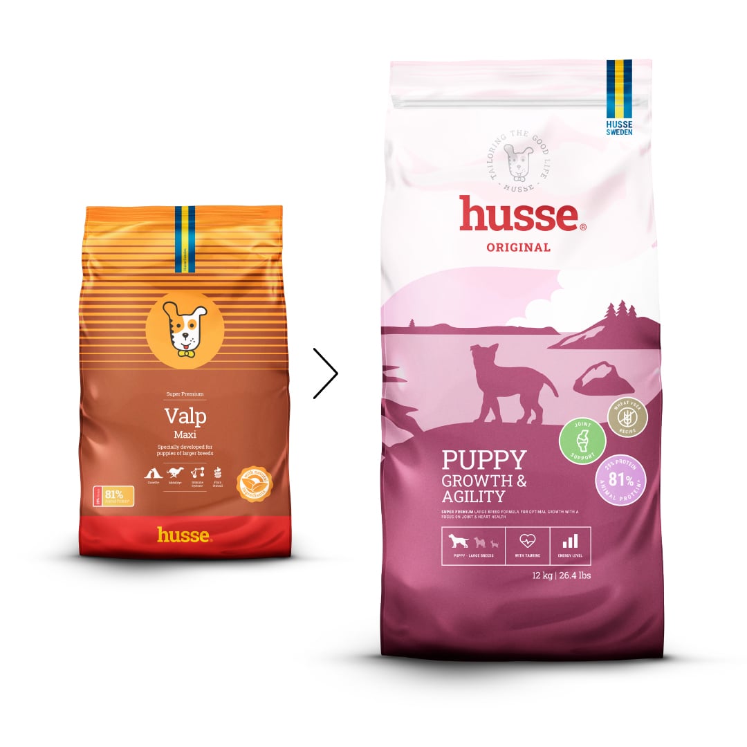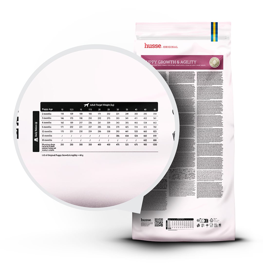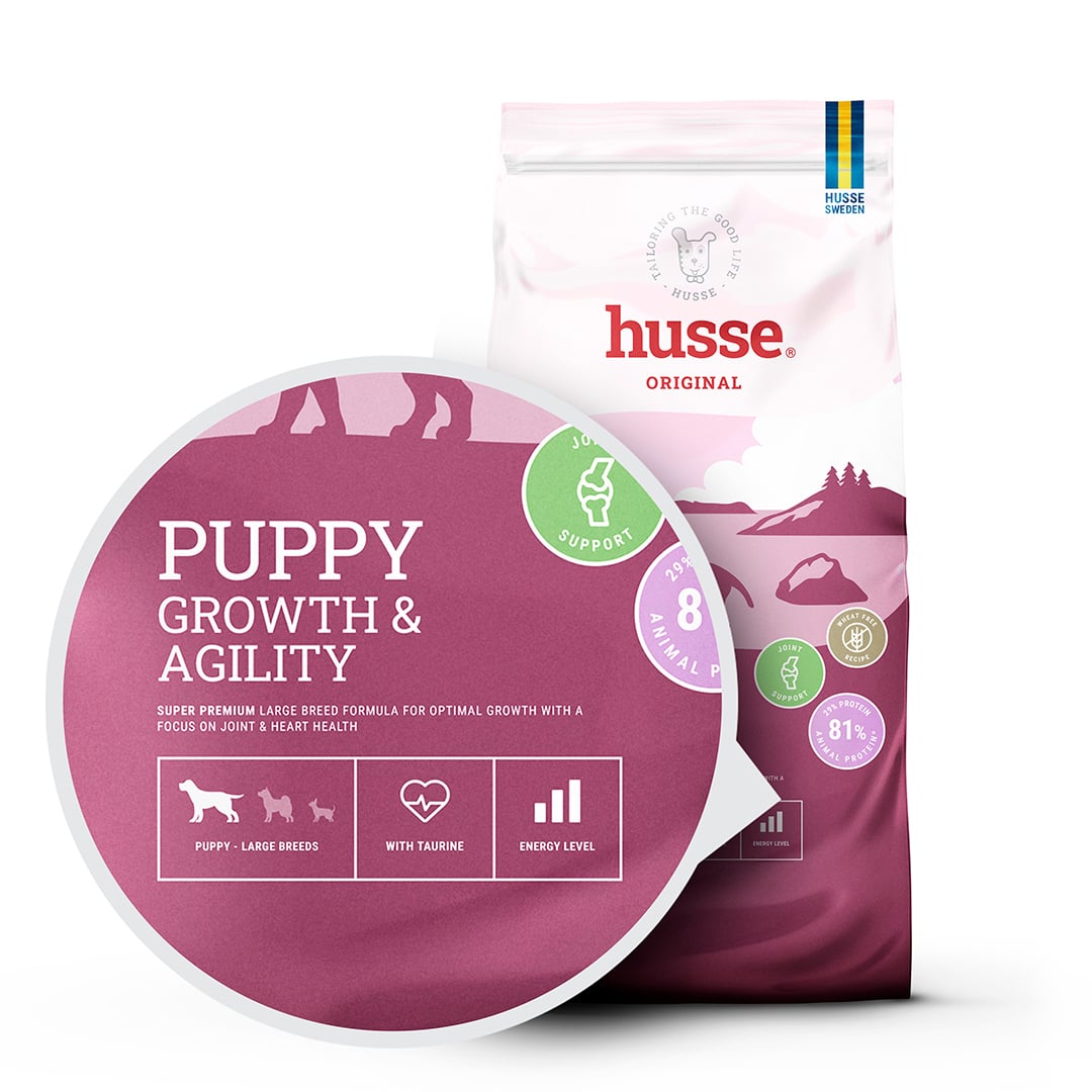 I cuccioli di taglia grande crescono rapidamente e sottopongono il loro corpo in via di sviluppo a sollecitazioni maggiori. Husse Puppy Growth & Agility è stato studiato per soddisfare queste esigenze con una formula completa e attentamente bilanciata che favorisce una crescita costante e sana. Arricchito con glucosamina e condroitina, aiuta a proteggere le articolazioni sottoposte a maggiore stress dovuto al rapido aumento di peso, mentre la taurina contribuisce alla salute del cuore. Ingredienti facilmente digeribili e prebiotici favoriscono una sana digestione e l'assorbimento dei nutrienti, e le crocchette di dimensioni maggiori sono studiate per adattarsi a mascelle più grandi e facilitare una corretta masticazione.