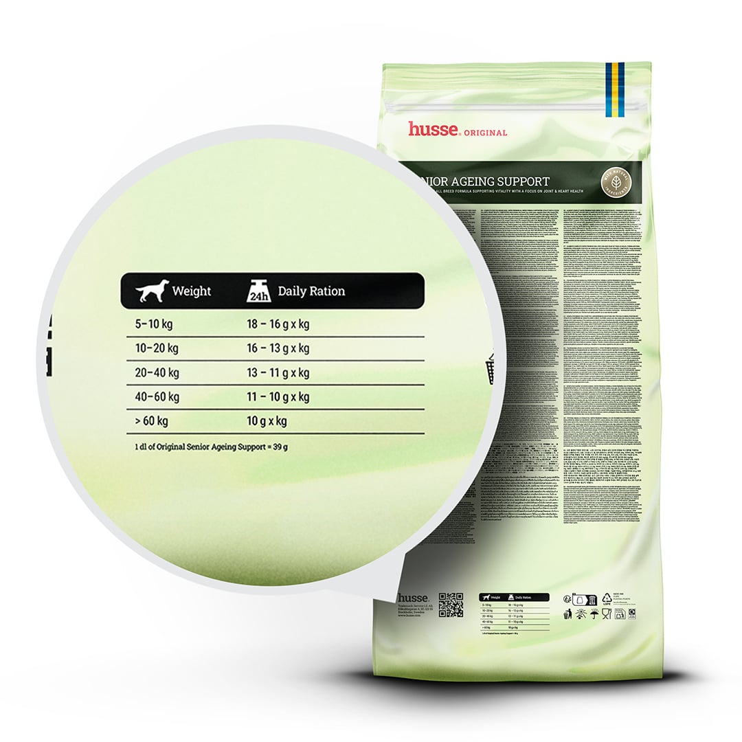 Husse Senior Ageing Support è una formula Super Premium appositamente sviluppata per cani anziani. Con un rapporto di proteine-grassi attentamente bilanciato, fornisce energia sufficiente senza calorie in eccesso, contribuendo a mantenere un peso sano, poiché il metabolismo rallenta naturalmente con l'età. Arricchito con glucosamina e condroitin solfato, supporta la salute e la mobilità delle articolazioni, mentre l'aggiunta di taurina contribuisce a mantenere una funzionalità cardiaca ottimale. La formula contiene anche antiossidanti, vitamine e acidi grassi essenziali per rafforzare il sistema immunitario, supportare la salute di pelle e pelo e promuovere la vitalità generale. Delicata sulla digestione grazie ai prebiotici e all'ottimo contenuto di fibre, questa ricetta aiuta i cani anziani a rimanere sani, attivi.